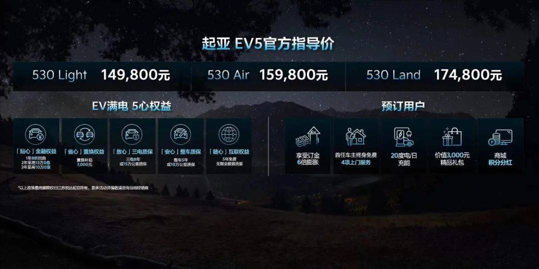 从价值来看,起亚EV5共推出3款车型,售价区间为14.98-17.48万元□□。本次率先上市的标续版车型,GT-Line版本将正在来岁7月上市□□。针对预订用户,官方还推出了一系列的优惠战略。值得一提的是,EV5是起亚为纪念来岁设立80周年而特殊推出的车型,事理出众。